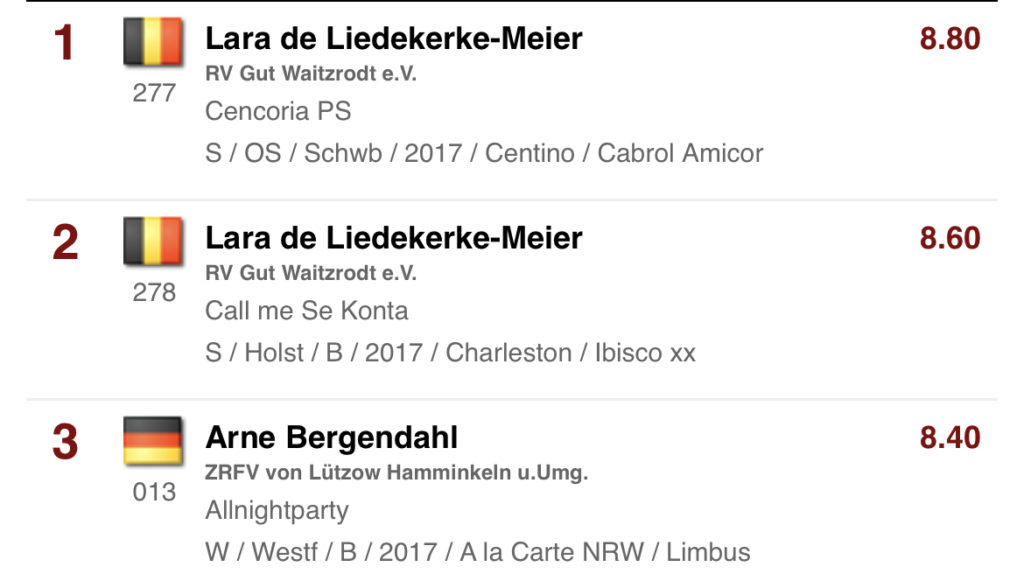 Sophie Lehmann startete ebenfalls in dieser Prüfung mit Amadeus. Sie holten mit einer Wertnote von 6,5 den 8. Platz.