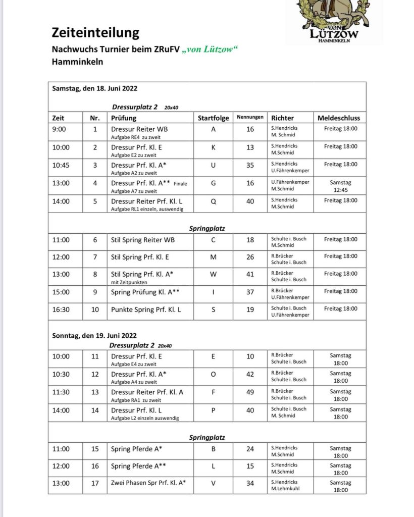 Zeiteinteilung Zeiteinteilung 9. Juni 2022 Catrin Mueller Anbei unsere Zeiteinteilung für unser Turnier am 18. und 19.06.2022. Wir freuen uns mit euch ein sportliches Wochenende zu verbringen!